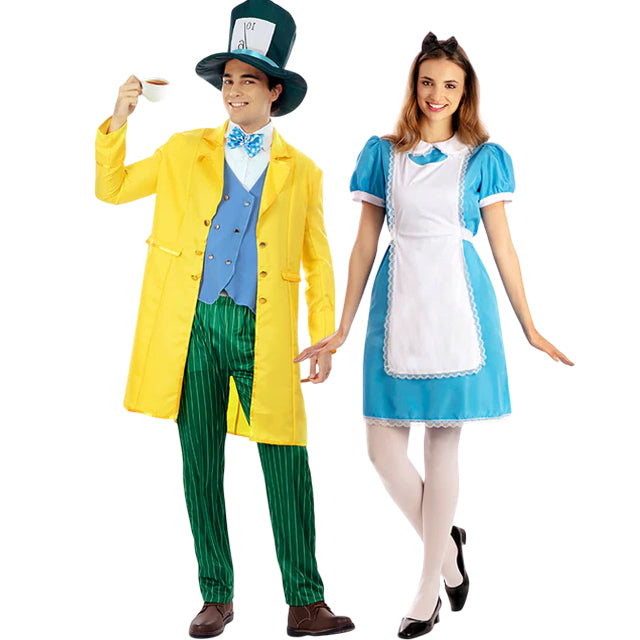 Das Hutmacher-Kostüm aus dem Alice-Film für Herren enthält: Hut, Hemd mit falscher Weste, Jacke, Hose und Fliege, während das Alice-Prinzessin-Kostüm für Damen: Kleid mit Schürze und Diadem enthält.