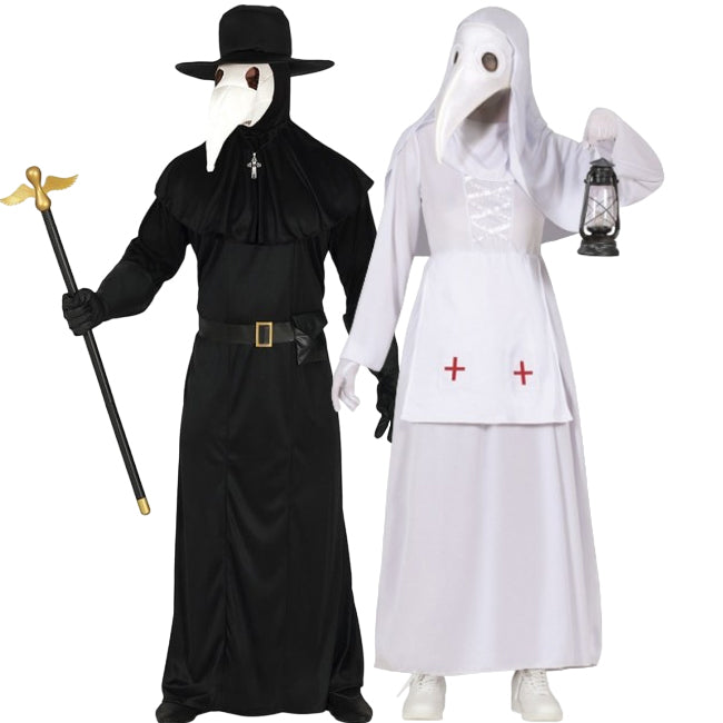 Das Nostradamus-Halloweenkostüm für Männer umfasst: Robe, Gürtel, Hut und Maske, während das Kostüm der schwarzen Pestkrankenschwester für Frauen Folgendes umfasst: Kapuze, Schürze, Maske und Kleid.
