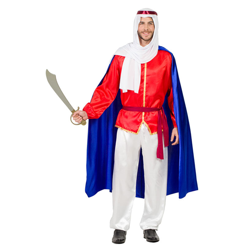 Das Original Beduine Arabisch-Kostüm für Erwachsene enthält: Kopftuch, Stirnband, Hemd, Hose, Gürtel und Umhang | Dieses Beduine Arabisch Herrenkostüm ist in einer Größe erhältlich.