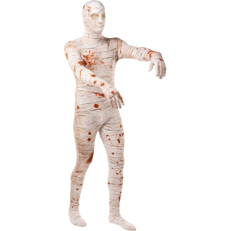 Blutige Mumie-Kostüm für Erwachsene mit Ganzkörperanzug in zweiter Haut und Rückenzip. In 5 Größen erhältlich. Realistisch, bequem und perfekt für Halloween.