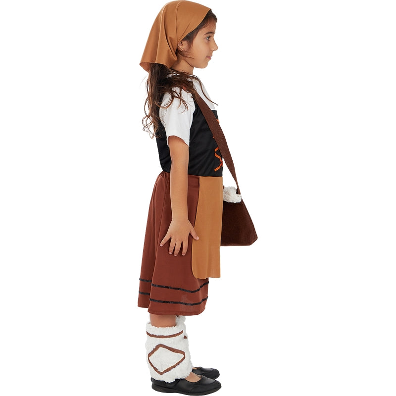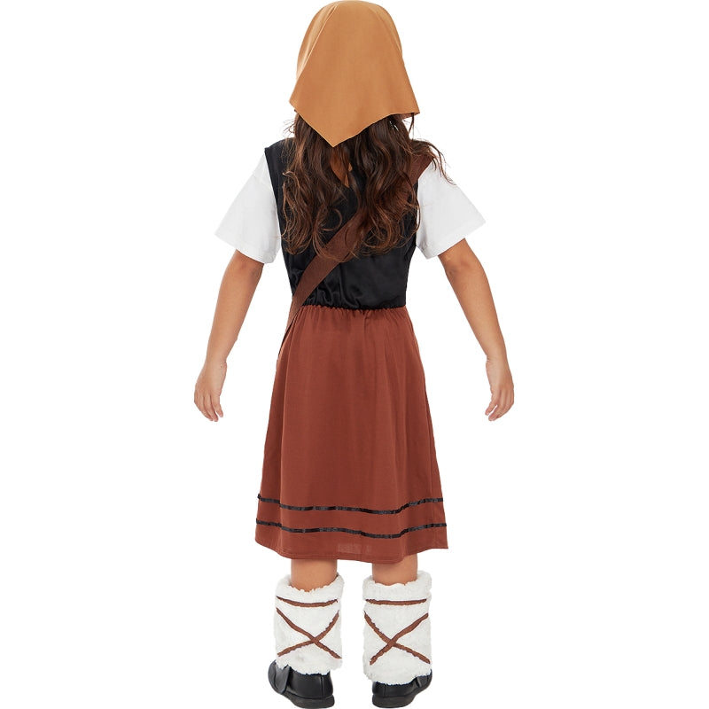 Das Original Braune Schäferin-Kostüm für Mädchen beinhaltet: Kleid, Beinstulpen, Halstuch und Umhängetasche | Dieses Ländliche braune Schäferin Kinderkostüm ist in 6 verschiedenen Größen erhältlich
