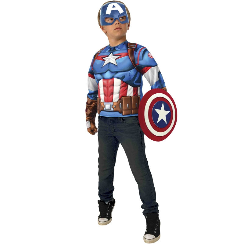 Das original Captain America Brustmuskelkostüm für Jungen beinhaltet: Muskelshirt, Maske, Handschuhe und Schild | Dieses Captain America Brustmuskelkostüm für Jungen ist nur in einer Größe erhältlich