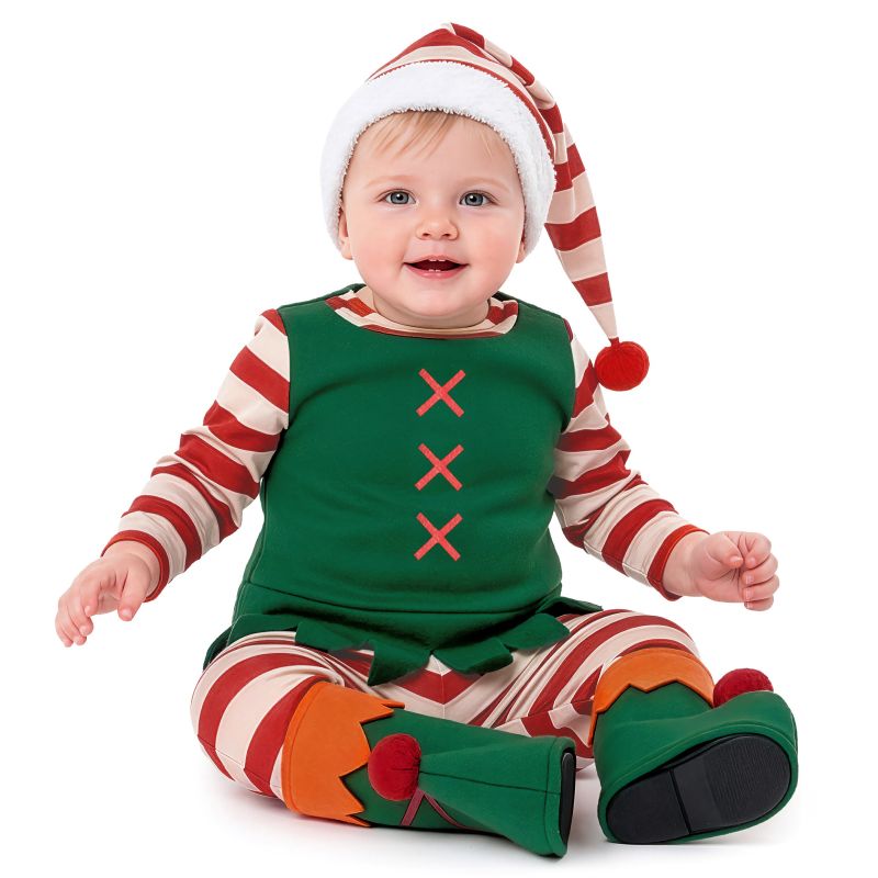 Elf DeluxeBaby Weihnachtskostüm beinhaltet: Mütze, T-Shirt, Hose, Stiefelüberzieher | Dieses Weihnachtself Babykostüm ist in 3 verschiedenen Größen erhältlichund ist eine tolle Idee für Weihnachten.