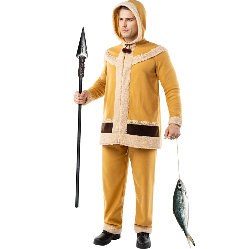 Dieses exklusive Kostüm für Eskimo vom Nordpol Männer enthält: Jacke und Hose | Dieses Männerkostüm, das Arktischer Bewohner in traditioneller Pelzkleidung nachahmt, ist in 4 verschiedenen Größen erhältlich und bitte beachten Sie, dass dies NICHT enthalten ist: Lanze und Angelrute