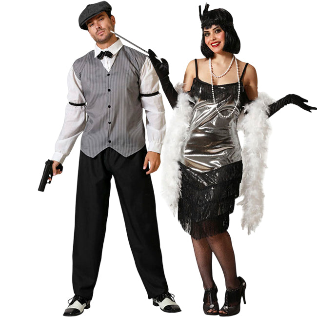 Das graue Gangsterkostüm für Herren enthält: Shirt und Hose, während das silberne Cabaret-Kostüm für Damen ein Kleid enthält.