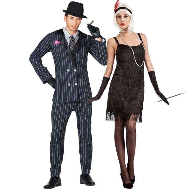 Das Chicago-Gangsterkostüm für Herren enthält: Jacke, Hose, Kragen und Krawatte, während das Charleston-Tänzerin-Kostüm für Damen Kleid und Stirnband mit Feder enthält.