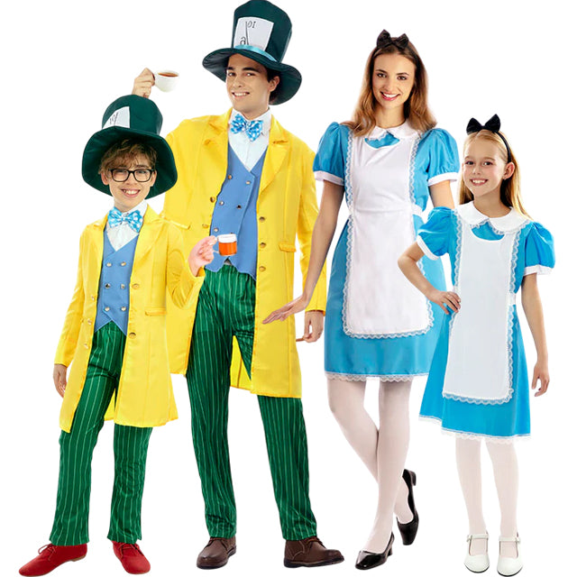 Fantastische Idee, die ganze Familie als Alice‑Abenteuer mit aufeinander abgestimmten Designs für Herren, Damen, Jungen und Mädchen zu verkleiden. Den Inhalt jedes einzelnen Kostüms finden Sie weiter unten im Abschnitt „Vervollständigen Sie Ihren Look“, wo jedes zu dieser Gruppe gehörende Kostüm einzeln aufgeführt ist.