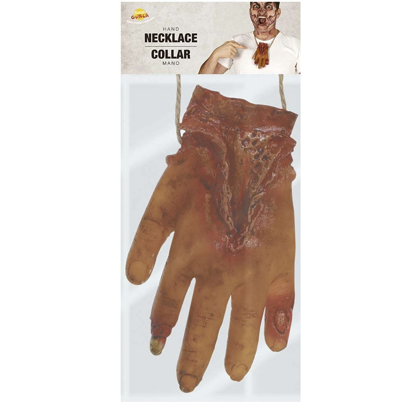 Original Halskette mit blutiger Hand zum Verkleiden bei Gruselpartys und Halloween. die Halskette mit einer blutigen Hand für das Zombie-Kostüm ist die perfekte originelle Ergänzung zu Ihrem Gruselkostüm, das auf jeder Horror-Faschingsveranstaltung überraschend und farbenfroh wirkt
