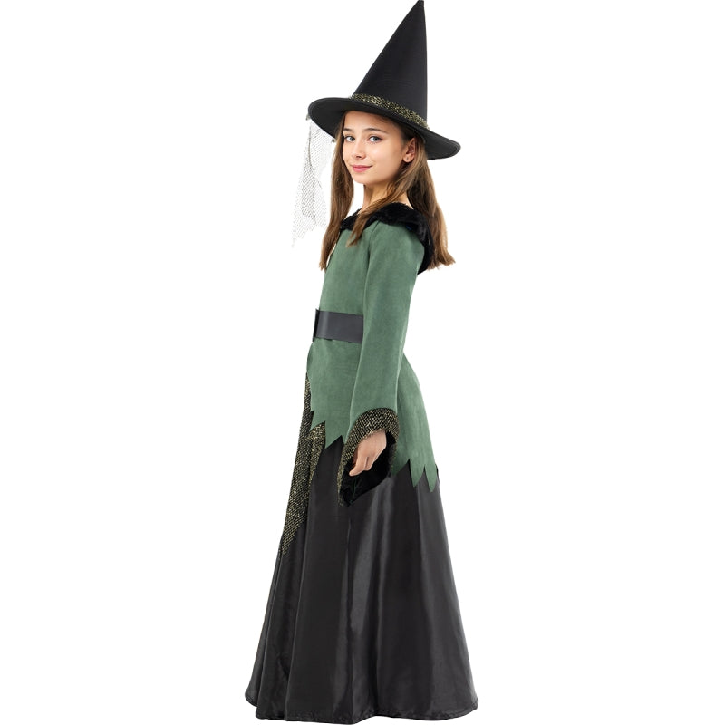Das Original Hexe Deluxe-Kostüm für Mädchen beinhaltet: Jacke, Rock, Gürtel und Hut mit Schleife | Dieses Deluxe-Halloween-Zauberin Kinderkostüm ist in 4 verschiedenen Größen erhältlich