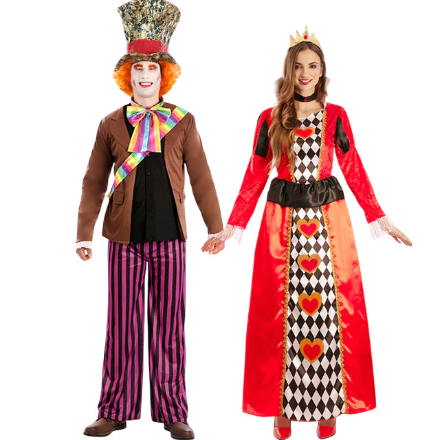 Kostüme des verrückten Hutmachers und der Herzkönigin, farbenfroher Look inspiriert von Alice im Wunderland.