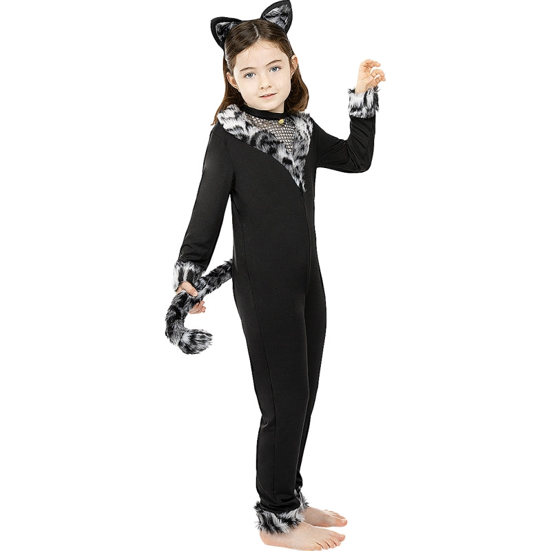 - Flexibler und weicher, schwarzer Overall, dekoriert mit Plüschdetails, um das Fell einer verspielten Katze zu simulieren