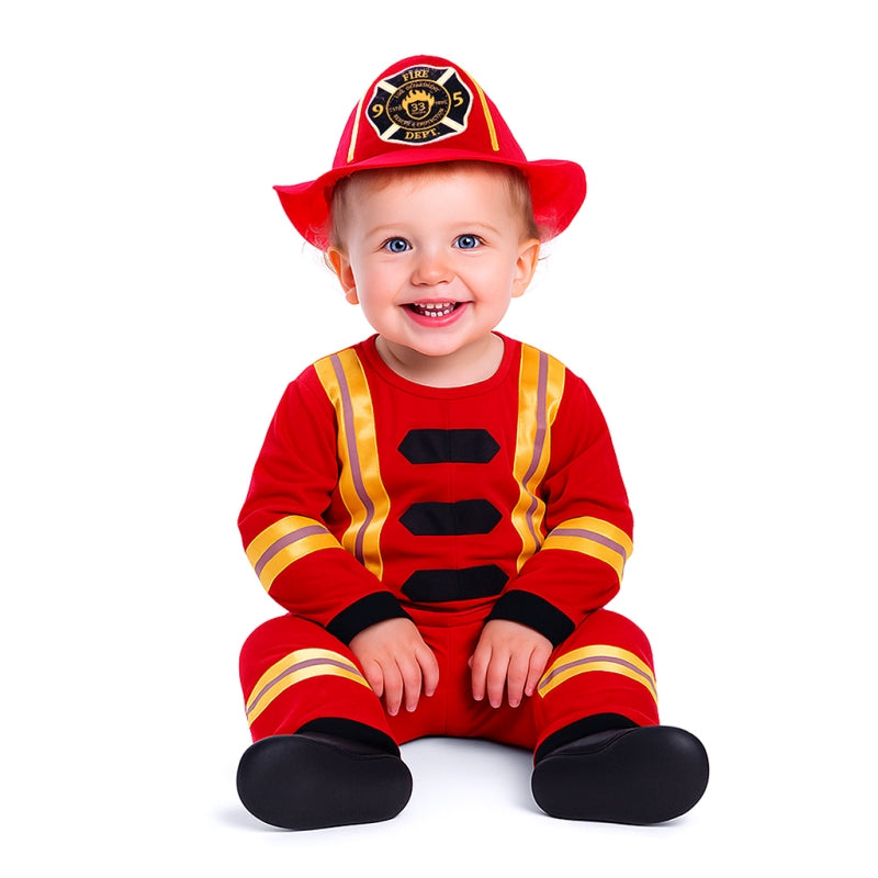Das Original Klassischer roter Feuerwehrmann-Kostüm für Kleinkinder enthält: Hemd, Hose, Mütze | Dieses Rote Feuerwehruniform Baby Kostüm ist in 2 verschiedenen Größen erhältlich