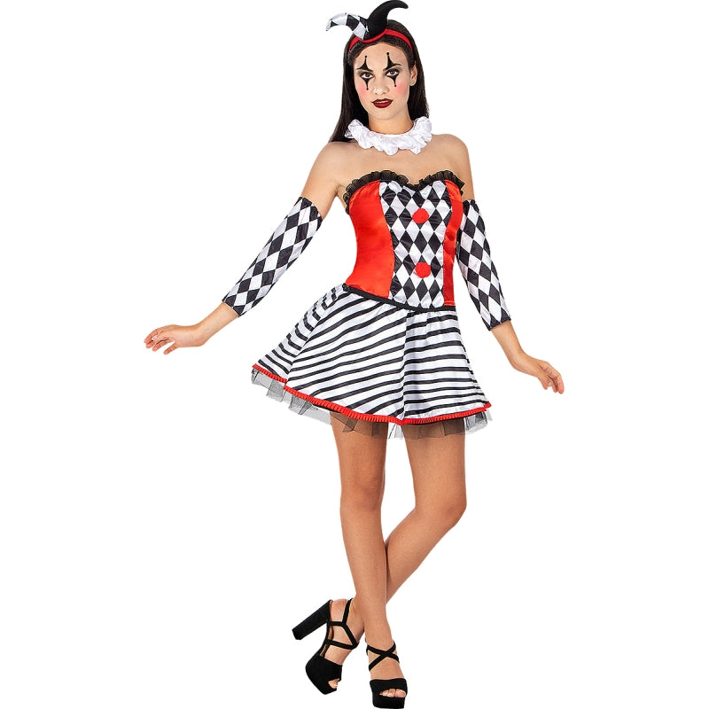 Dieses exklusive Kostüm für Sexy Harlekin Frauen enthält: Kleid, Armschützer, Kragen und Diadem | Dieses Damenkostüm, um sich in theaterclown mit verführerischer haltung zu verwandeln, ist in 6 verschiedenen Größen erhältlich