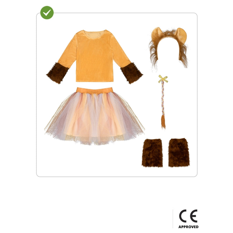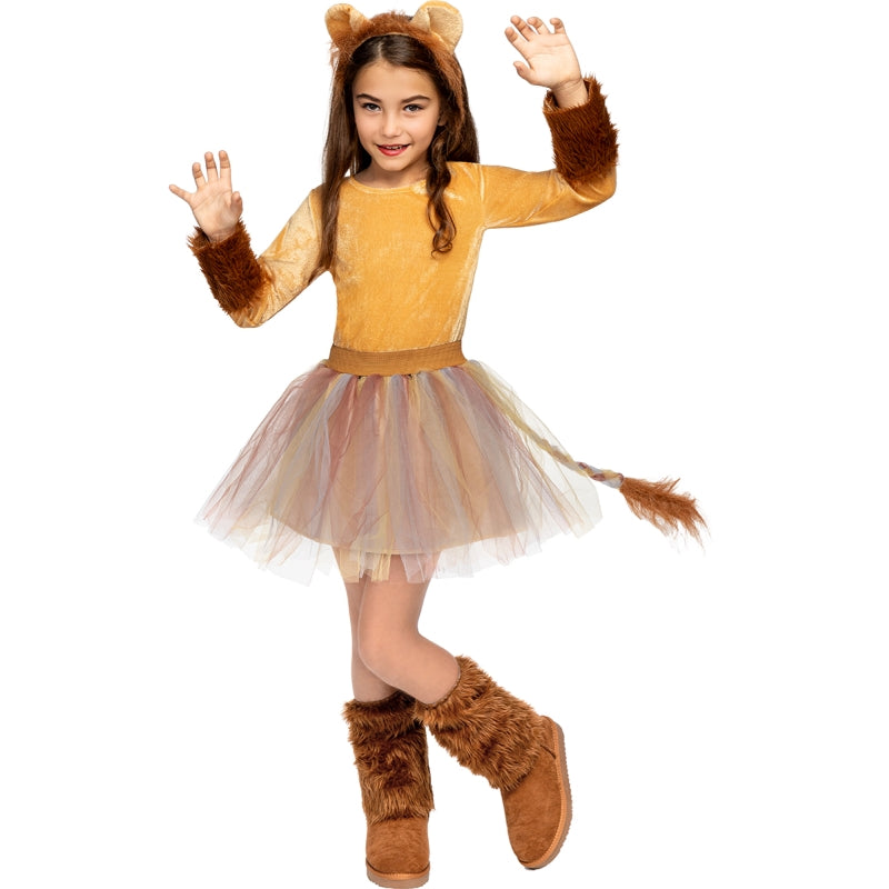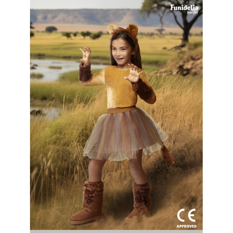 Das Original Löwin-Kostüm für Mädchen beinhaltet: T-Shirt, Tutu, Beinstulpen und Haarreif | Dieses Wilde Löwin mit Mähne Kinderkostüm ist in 4 verschiedenen Größen erhältlich