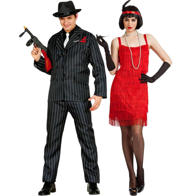 Das Mafia-Gangsterkostüm für Herren enthält: Jacke, Hose und Halstuch, während das rote Charleston-Tänzerin-Kostüm für Damen Kleid und Stirnband mit Feder enthält.