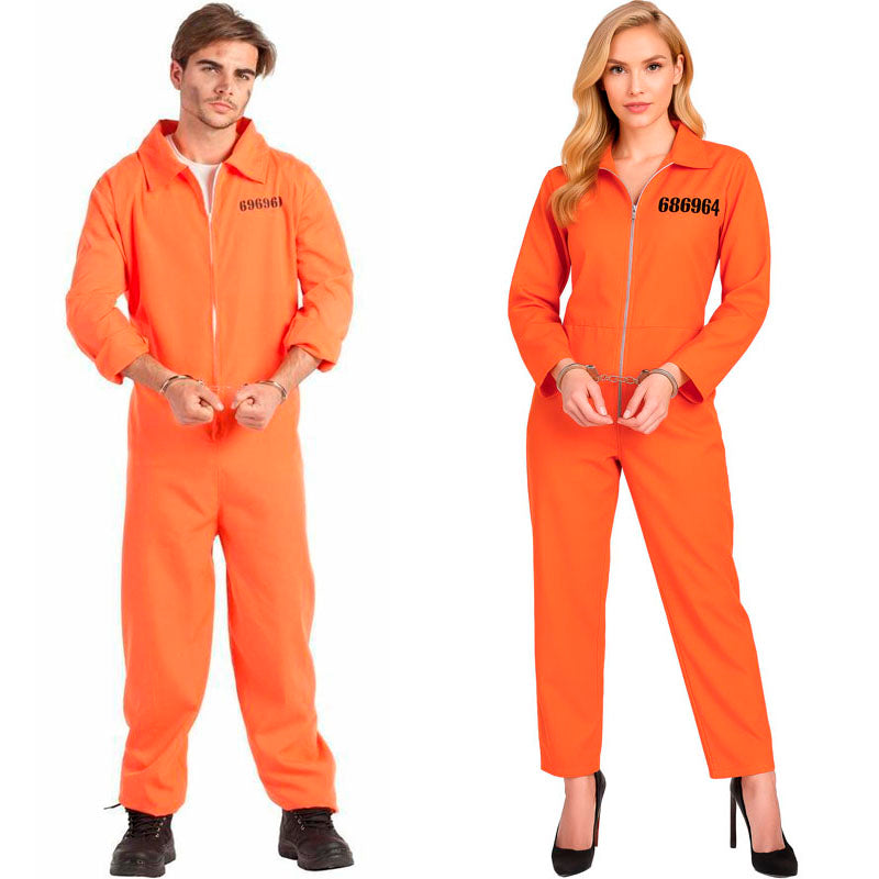 Das orangefarbene Häftlingskostüm für Herren enthält: Overall, während das orangefarbene Häftlingskostüm für Damen Folgendes enthält: Overall.