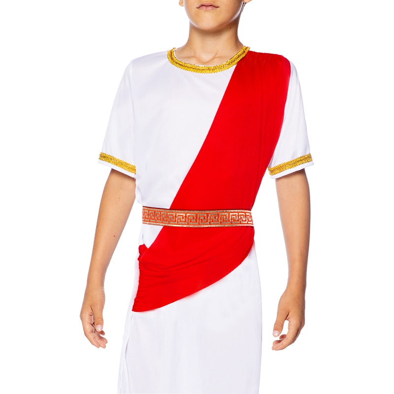 Das exklusive Römischer Prinz Kinderkostüm enthält: Kleid mit Stola und Gürtel | Dieses Kinderkostüm, das Römischer Prinz imitiert, ist in 4 verschiedenen Größen erhältlich.
