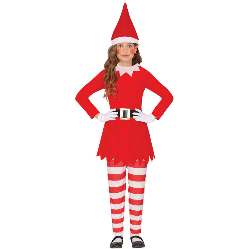 Schelmisches Elfenkostüm für Mädchen mit Kleid mit simuliertem Gürtel, Mütze und Hose. In 4 Größen erhältlich. Inspiriert vom Trend des schelmischen Elfs – dieses Kostüm lässt die Tradition „The Elf on the Shelf“ auf festliche und magische Weise lebendig werden.