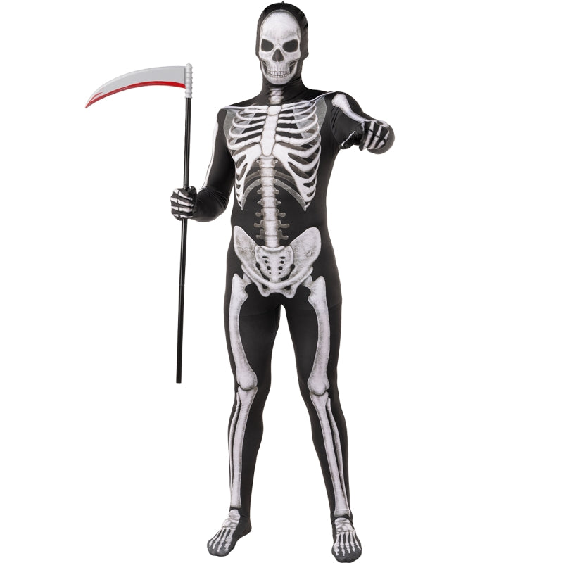 Skelett-Tod-Kostüm für Herren mit Ganzkörperanzug in zweiter Haut und Rückenzip. In 5 Größen erhältlich. Sense nicht enthalten. Ideal für einen gruseligen, realistischen Look.