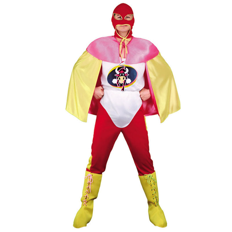 Das Original Spanisches Superhelden-Kostüm für Erwachsene enthält: T-Shirt, Slip, Hose, Stiefelüberzüge, Kapuze und Umhang | Dieses Spanisches Superhelden Herrenkostüm ist in 2 verschiedenen Größen erhältlich.