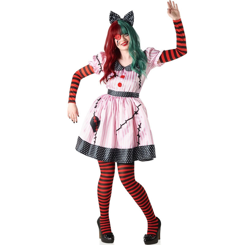 Unheimliche Stoffpuppe Halloween Kostüm für Erwachsene beinhaltet: Kleid, Kappe, Patch, Gürtel, Strümpfe und Ärmel | Dieses gruselige Puppe Kostüm für Frauen ist in 2 verschiedenen Größen erhältlich