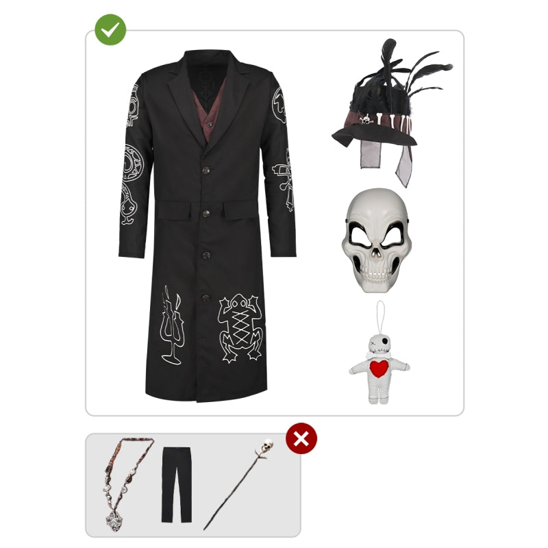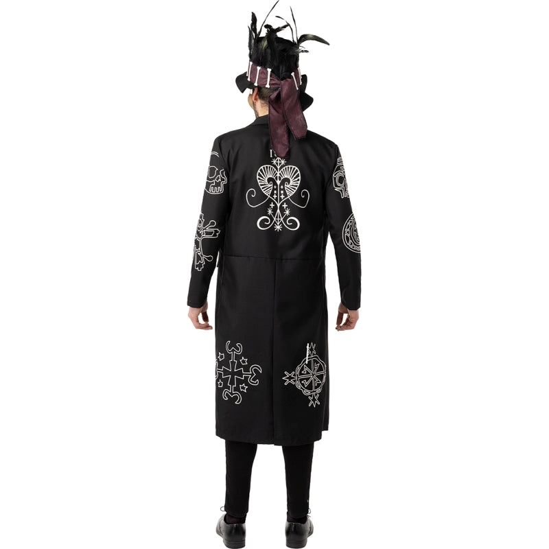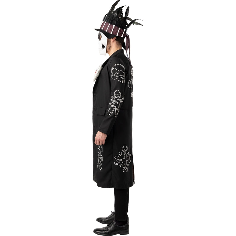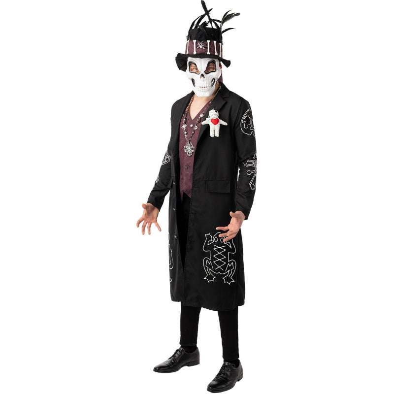 Voodoo-Skelettkostüm für Herren mit Jacke, Weste, Voodoo-Puppe, Hut und Maske. In 3 Größen erhältlich. Stock nicht enthalten. Ideal für gruselige Partys.