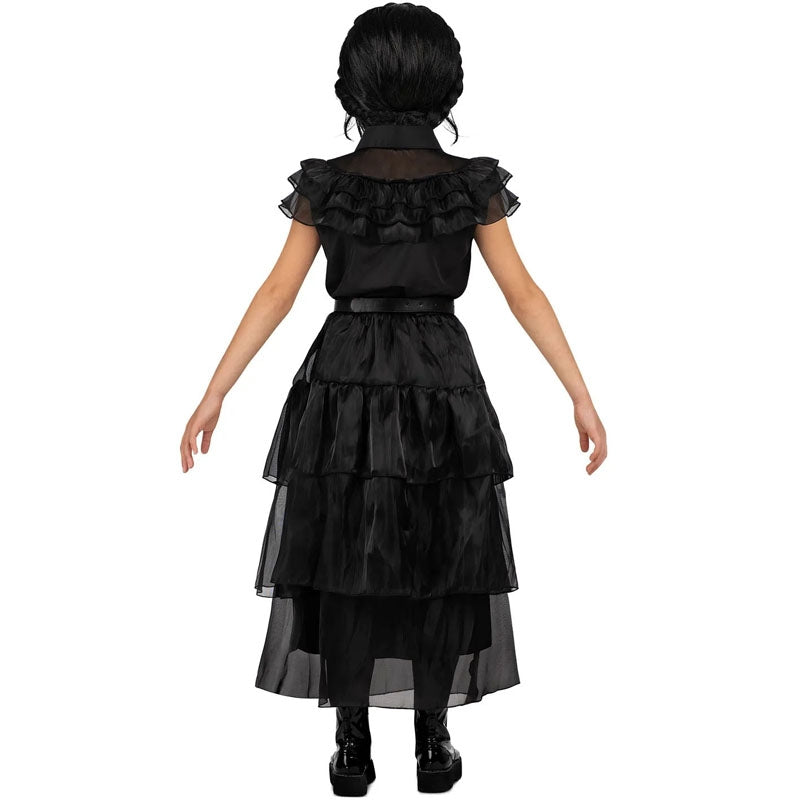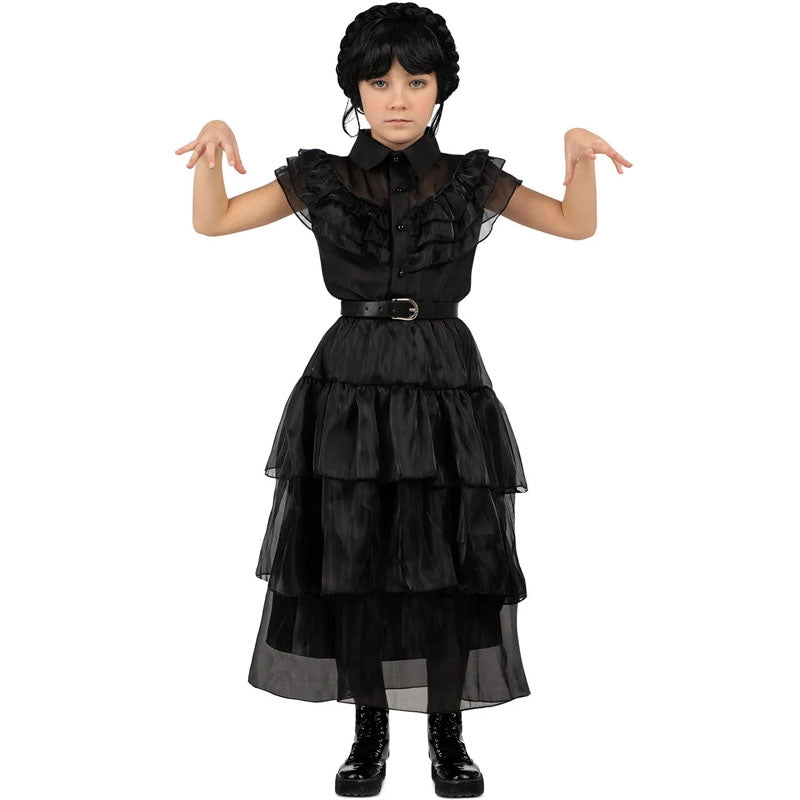 Mädchen Wednesday Addams Ballkönigin Halloween Kostüm beinhaltet: schwarzes Kleid und Gürtel | Dieses Wednesday von der Addams Family tanzt Goo Goo Muck von The Cramps in Kostüm für Mädchen ist in 4 verschiedenen Größen erhältlich